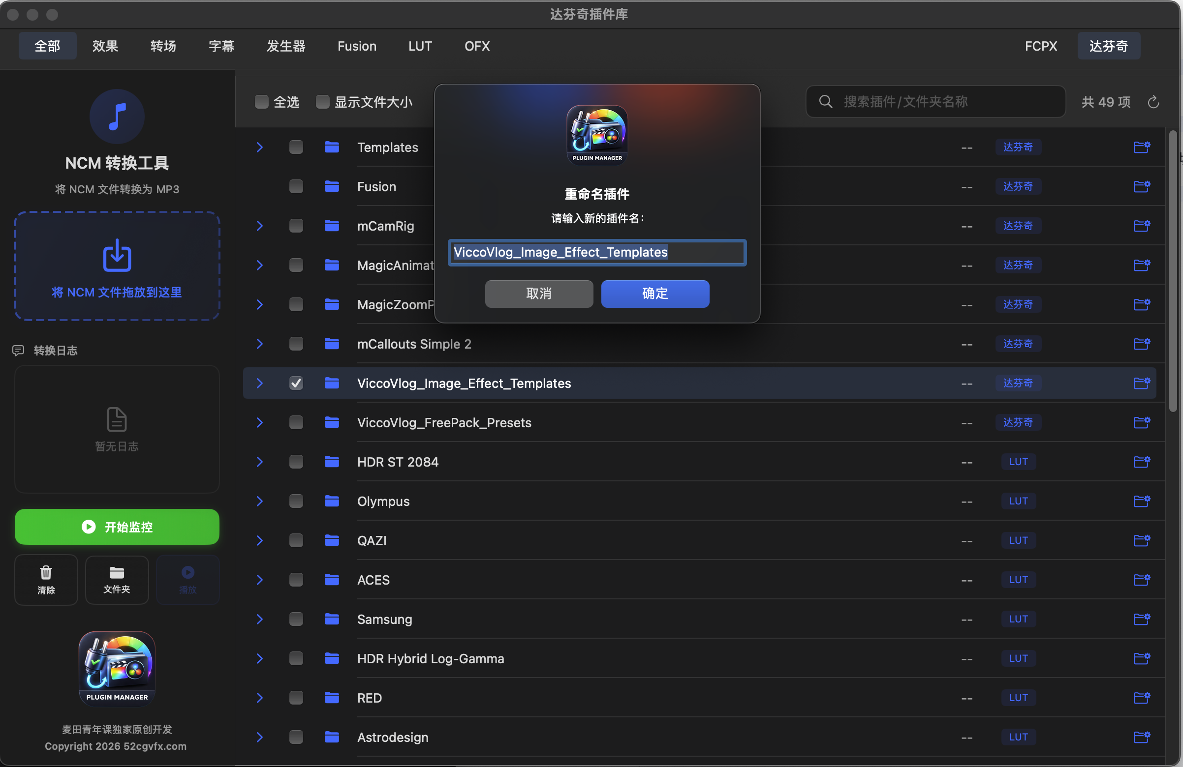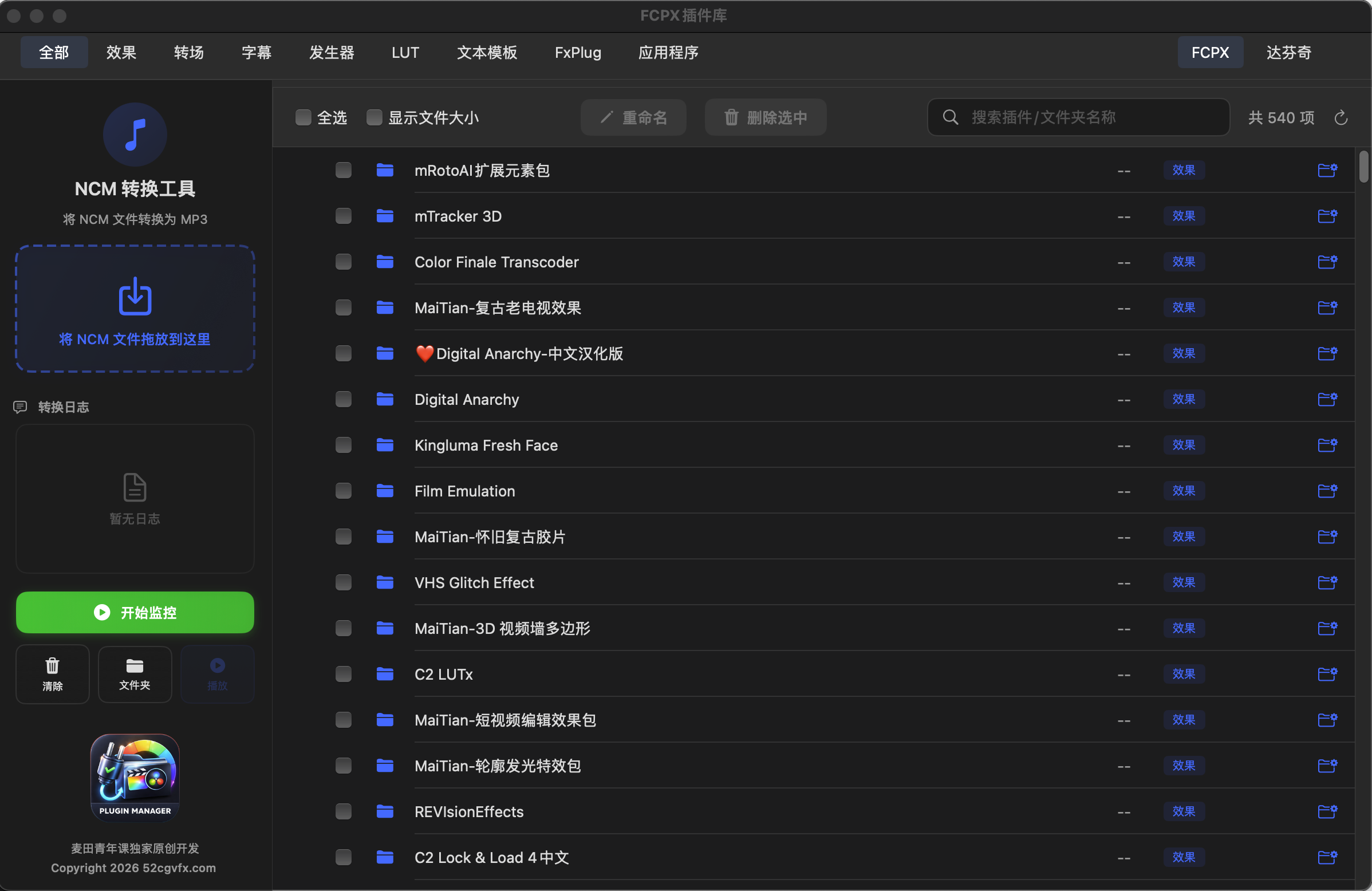 Uninstallation 插件管理工具涵盖多类软件插件管理及文件转换功能,其中针对 Final Cut Pro (FCPX) 插件,可扫描并分类显示效果、转场、字幕、发生器、LUT、文本模板、FxPlug、应用程序等各类插件,支持按分类筛选与搜索,同时具备批量选择与删除、插件重命名(OFX 格式插件不允许重命名)、在 Finder 中定位插件的功能,还可选择显示文件大小,针对大目录会自动优化计算以避免卡顿;针对 DaVinci Resolve 插件,能够扫描并显示.drfx 模板(包含效果、转场、字幕、发生器、Fusion 等类型)、LUT 及 OFX 插件,支持按分类筛选与搜索、批量删除操作,可对.drfx 内部的.setting 文件进行重命名与删除,也能在 Finder 中定位插件,文件大小显示功能可选(.drfx 插件直接使用文件大小数据);工具内置的 NCM 转换工具,支持将.ncm 文件转换为.mp3 格式,支持拖拽方式进行转换,还可监控默认目录并实现批量转换;权限与激活方面,工具部分功能需要激活后才能使用,而删除、重命名、修改插件等操作可能需要获取系统管理员权限;关于联系与支持,用户若发现 BUG 可通过邮箱 347236112@qq.com 反馈,也可添加客服微信 347236112 寻求帮助。